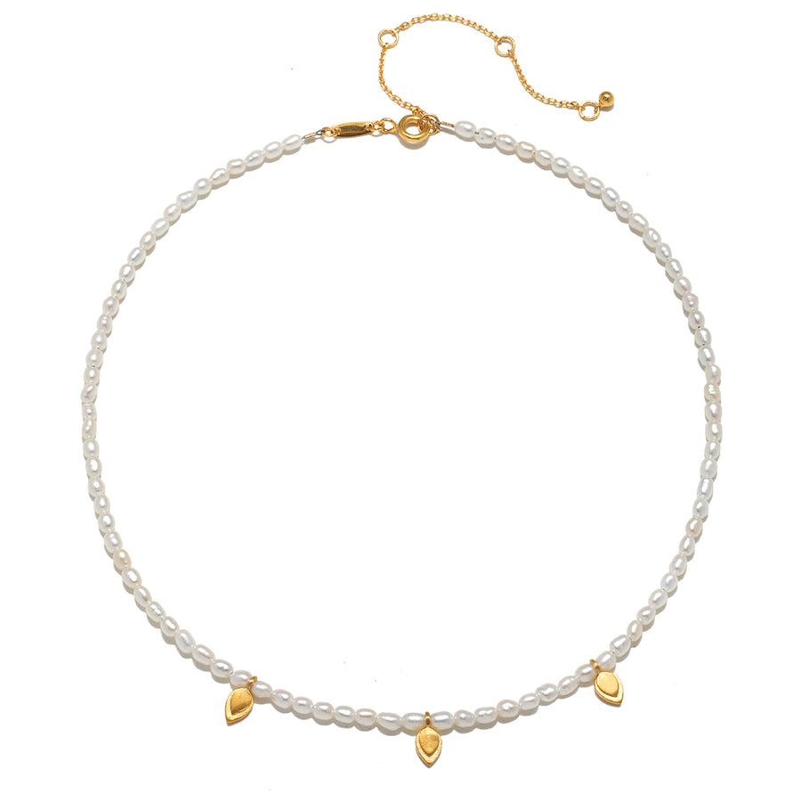 Within each of us is the budding promise to reach our full potential; let nature inspire you to bloom. A luminous mother of pearl necklace is accented with 18kt gold plated lotus petals to harness harmony, new beginnings, and full potential. Wear this pearl necklace alone for a simple statement, or as part of your personalized layered look.