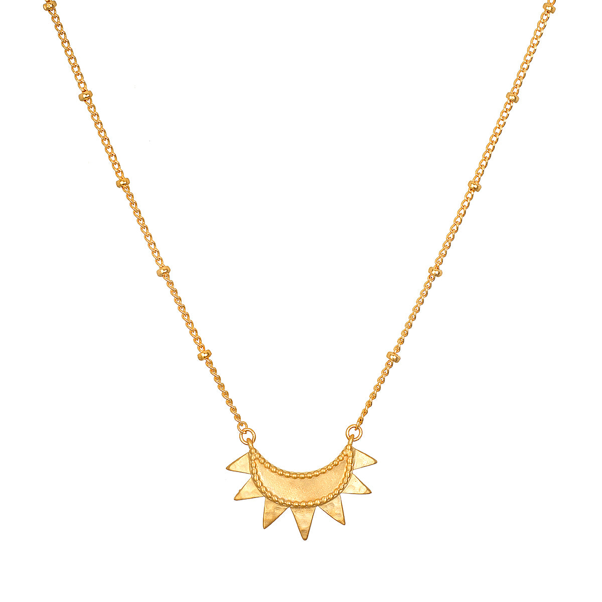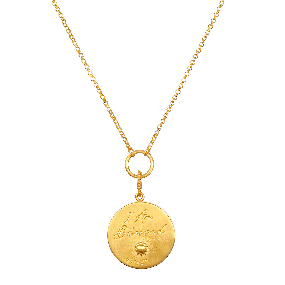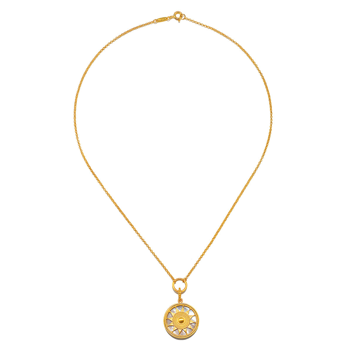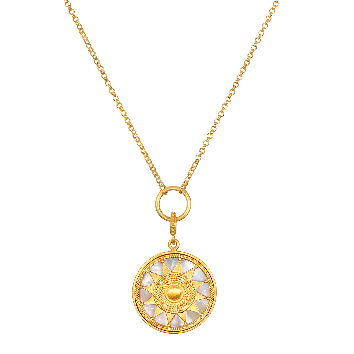 Journey inward to discover peace; all the serenity you seek exists within you. Two necklaces in 18kt gold plate shine with a partial sun and a mandala, symbols of vitality and peace. On one necklace, the rays of the sun radiate outward, creating a delicate fan of light. On the other, luminous mother of pearl creates the background for a brilliant mandala, a design representing peace, harmony, and the sacred infinite cycle. Wear these styles alone or layer them together to set your intention for peace.