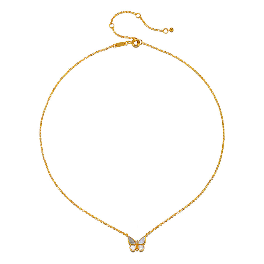 Each day is an invitation for renewed hope and an opportunity to transform. A delicate butterfly spreads its wings of luminous mother of pearl, stone of harmony and positive energy to overcome challenges. Just as a butterfly emerges from its cocoon to spread its wings, this gleaming 18kt gold plated necklace is an invitation to embrace change and hold hope close to our hearts.